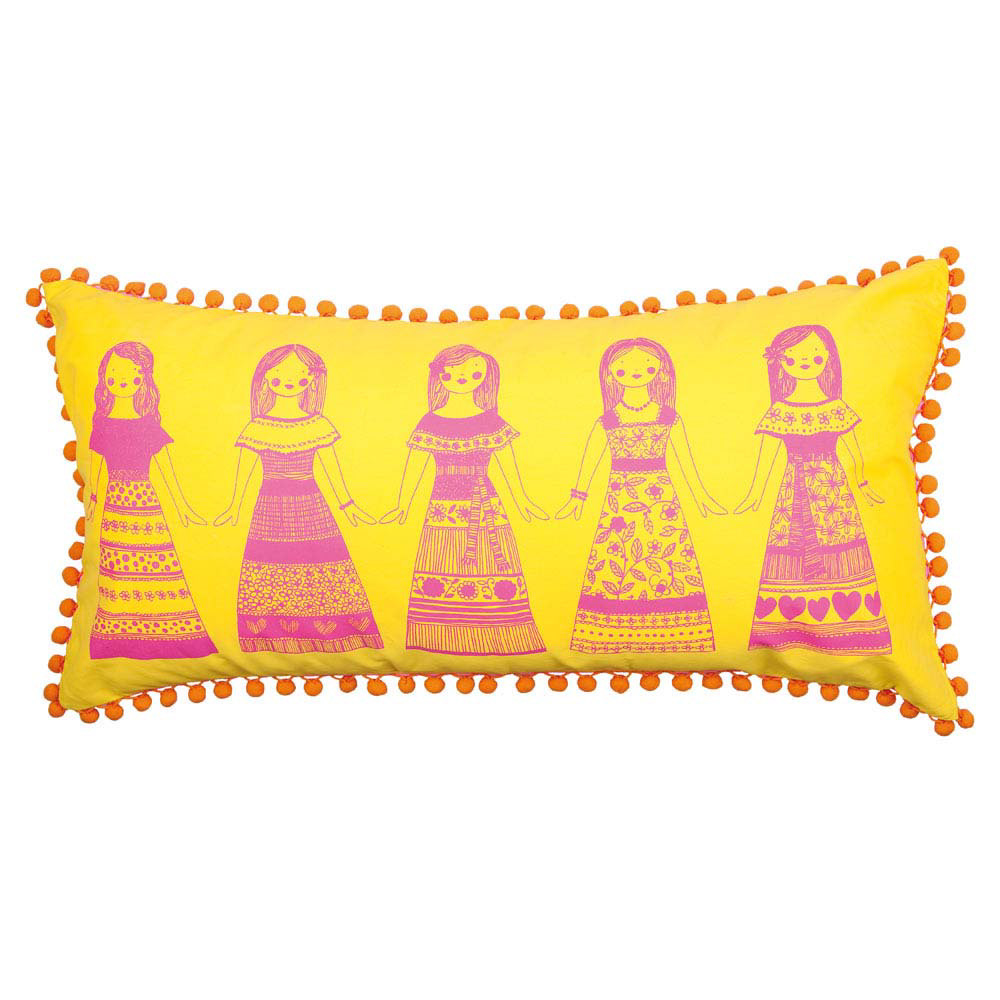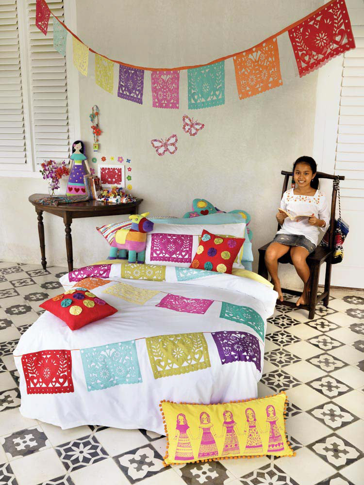 An applique bed linen design for girls featuring laser cut papel picado banners.
